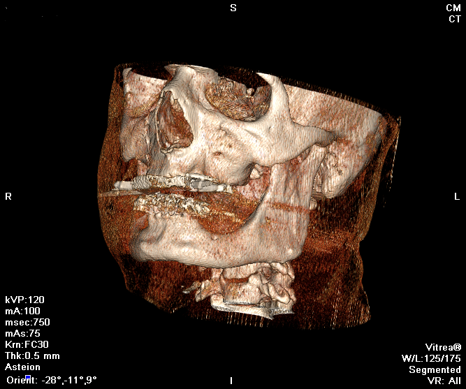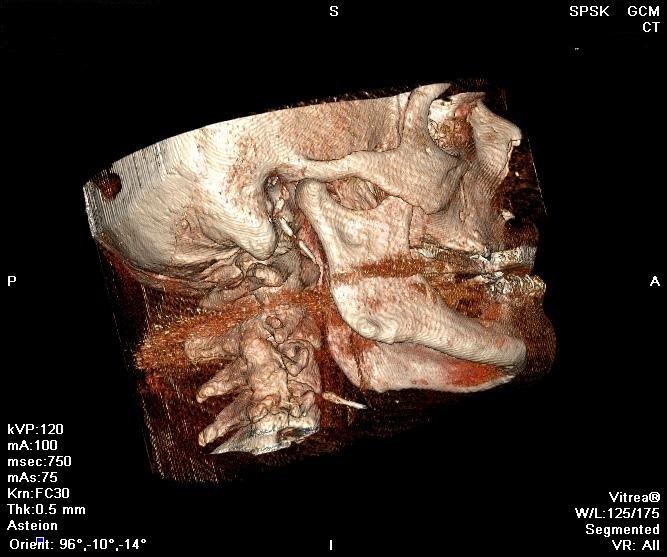 Wir sind im Stande, Modelle sowohl für orthopädischen, wie auch stomatologischen Schulungen vorbereiten. Modelle können auf Grundlage der DICOM-Dateien eines konkreten medizinischen Falls, mit Benutzen eines CT, oder CBCT hergestellt werden. Figuren 1 und 2 zeigen CT-Bilder eines Patienten.