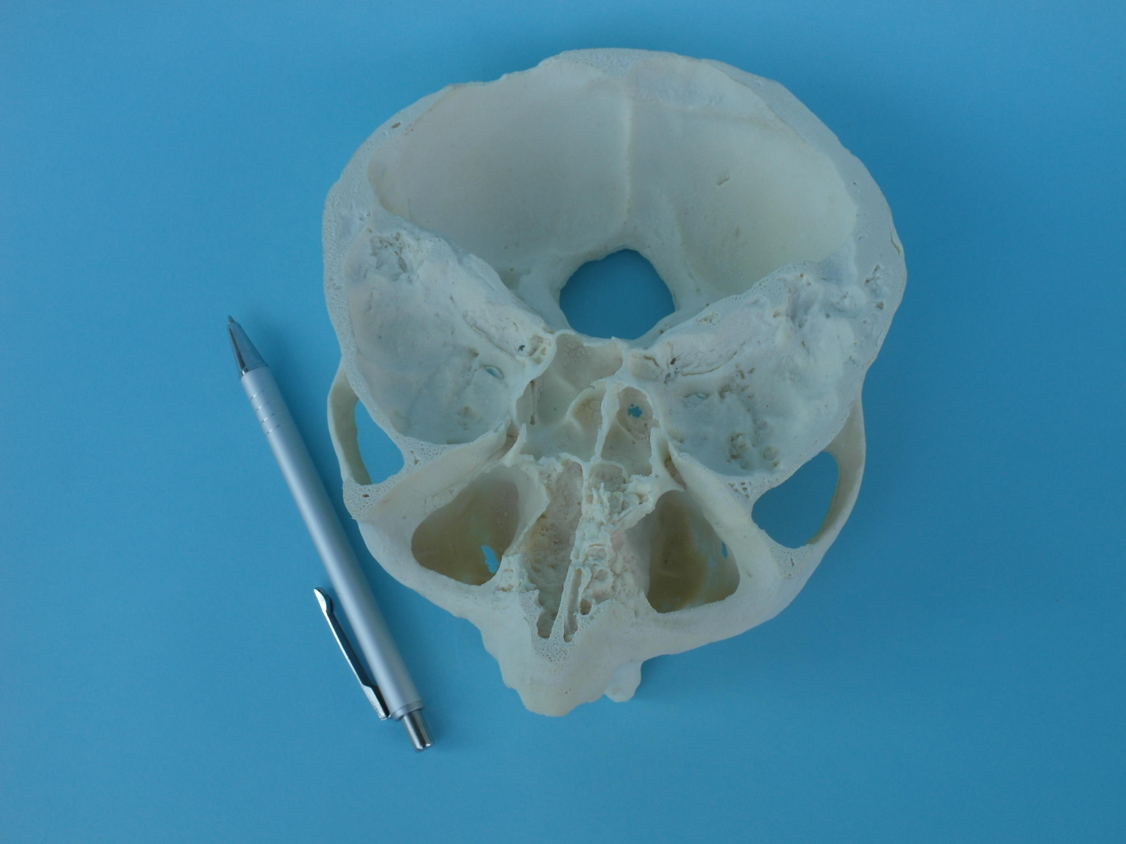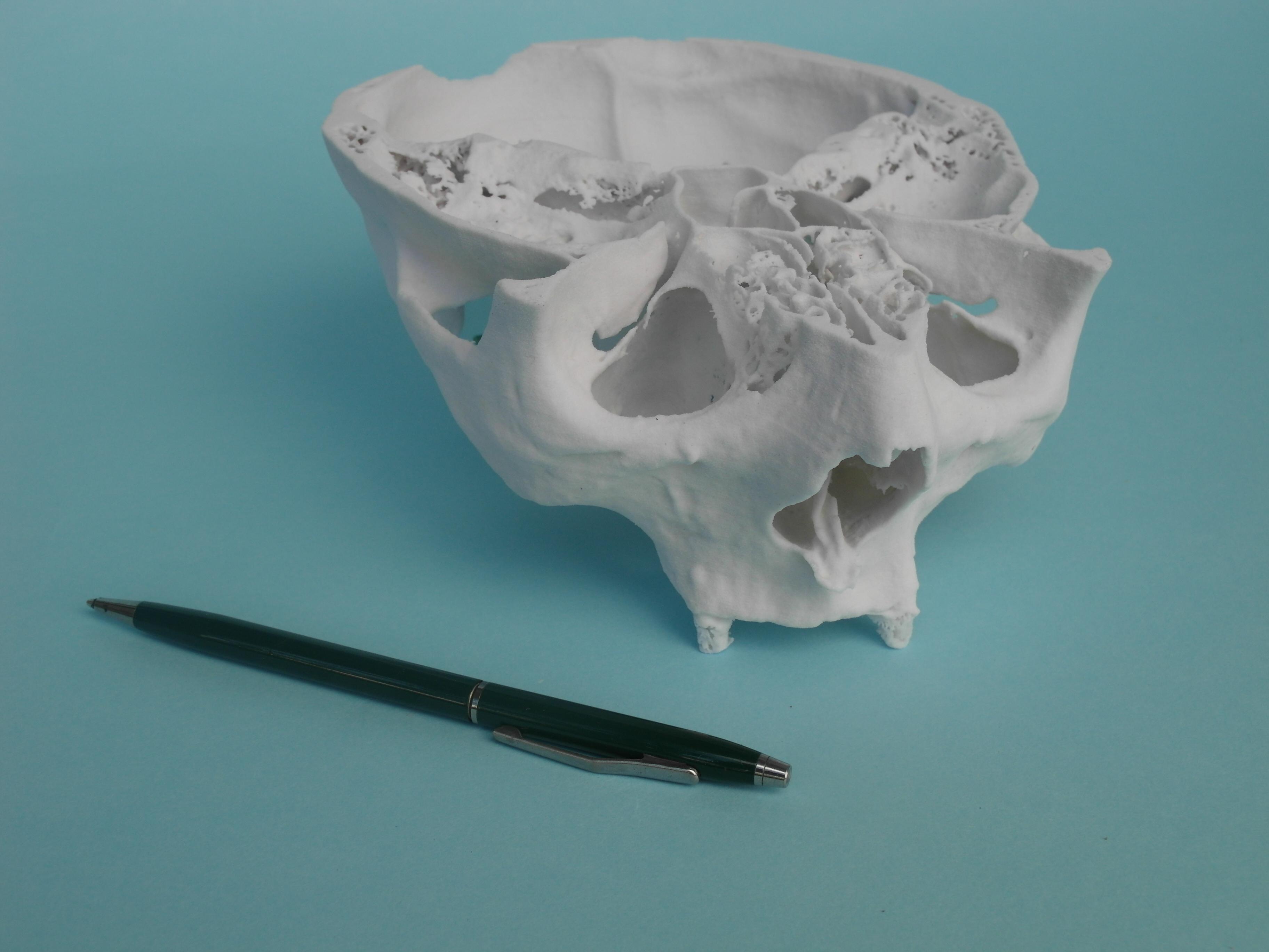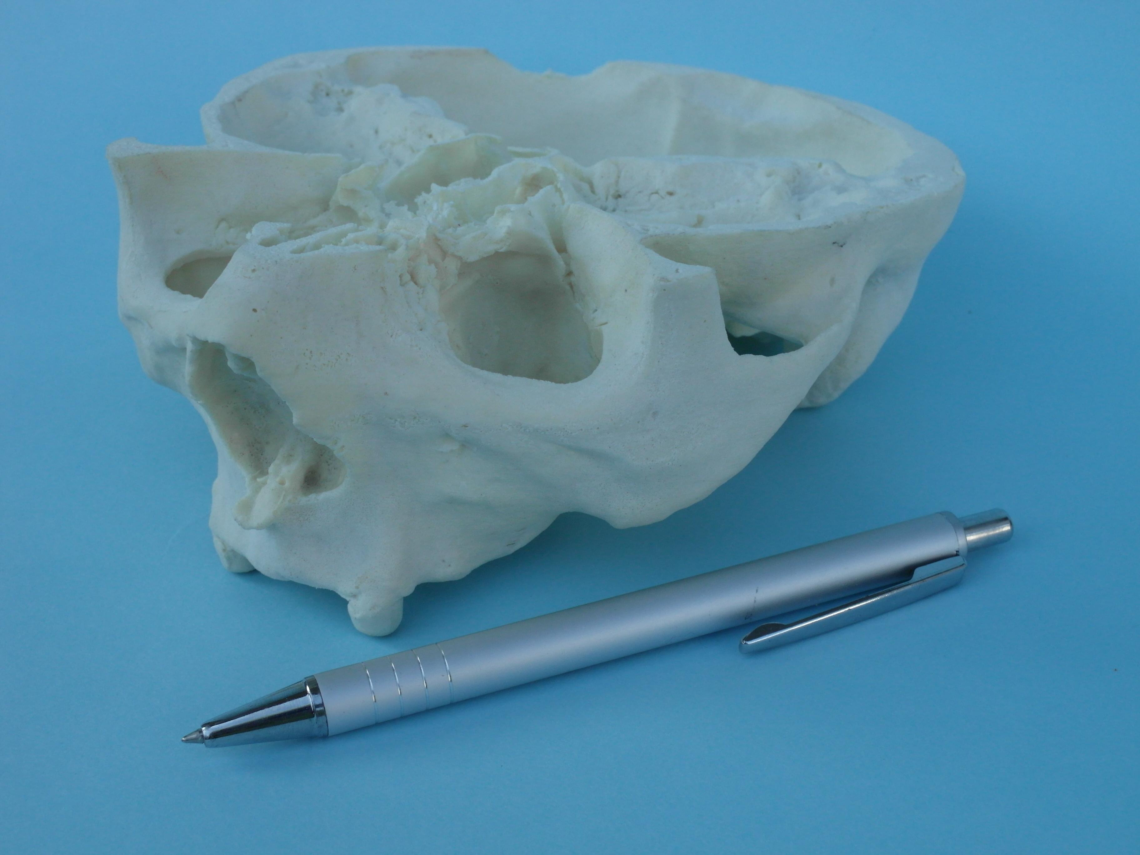 In der nächsten Etappefertigen wir einen Prototyp auf dem 3D-Drucker. Dieser Prototyp, abhängig von der verlangten Qualität (Genauigkeit), kann mit der Methode 3D Print SLA, oder SLS hergestellt werden. In dieser Etappe, abhängig von Bedürfnissen können einige Vereinfachungen der Knochenform vorgenommen werden. Im diesen konkreten Fall wurde der Innenbau des Nasenhöhle vereinfacht, da sie unwesentlich im konkreten Behandlungsprozess war. Auf der Grundlage des im diesen Prozess erlangtem Prototyp fertigen wir eine Modellserie aus Material mit Parametern des natürlichen Knochens. Über finale Härte/Dichte des Knochens wird eine Entscheidung der Kunde treffen.