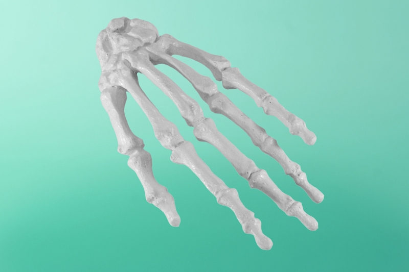Kości dłoni lewej. Model wykonany w wersji materiałowej C z jednorodnego materiału, wykonany w formie uproszczonej w postaci jednego elementu (stawy nieruchome). Całkowita długość: 210 mm.