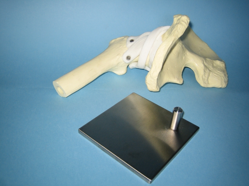 Staw kolanowy średni lewy o łącznej długości 500 mm w wersji materiałowej B, z wewnętrznym walcowym kanałem o średnicy 12 mm. Dwie kości połączone są trzema elastycznymi elementami.