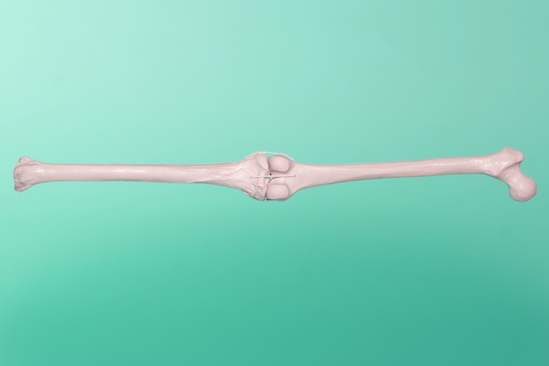 Linkes, großes Kniegelenk, 805 mm lang, angefertigt in der Materialversion B, einschließlich innerem Walzkanal vom Durchmesser 12 mm. Zwei Knochen sind durch drei elastische Elemente verbunden. Katalognummer 40-1000B