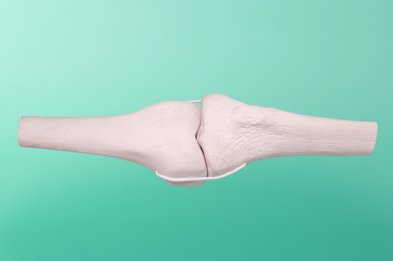 Linkes, mittleres Kniegelenk, 500 mm lang, angefertigt in der Materialversion B, einschließlich innerem Walzkanal vom Durchmesser 12 mm. Zwei Knochen sind durch drei elastische Elemente verbunden.