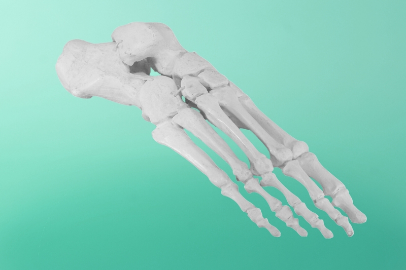 Rechter Fuß, Gesamtlänge 259 mm, der aus vier Teilen mit Sprungbein, Fersenbein, des Seiten- und Medialteiles, mit Bändern verbunden. Ausgeführt in Materialversion C.