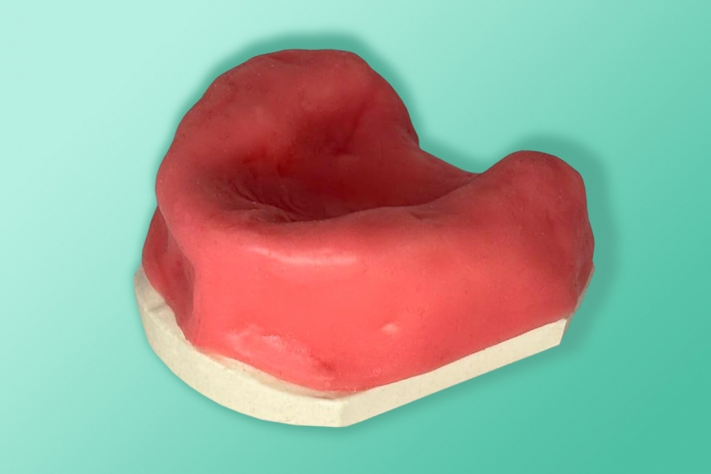 Modell des zahnlosen Oberkiefers mit einer Nachahmung der Schleimhaut. Der Oberkiefer hat einen breiteren anterioren Alveolarfortsatz, um das Implantat-Training zu erleichtern.